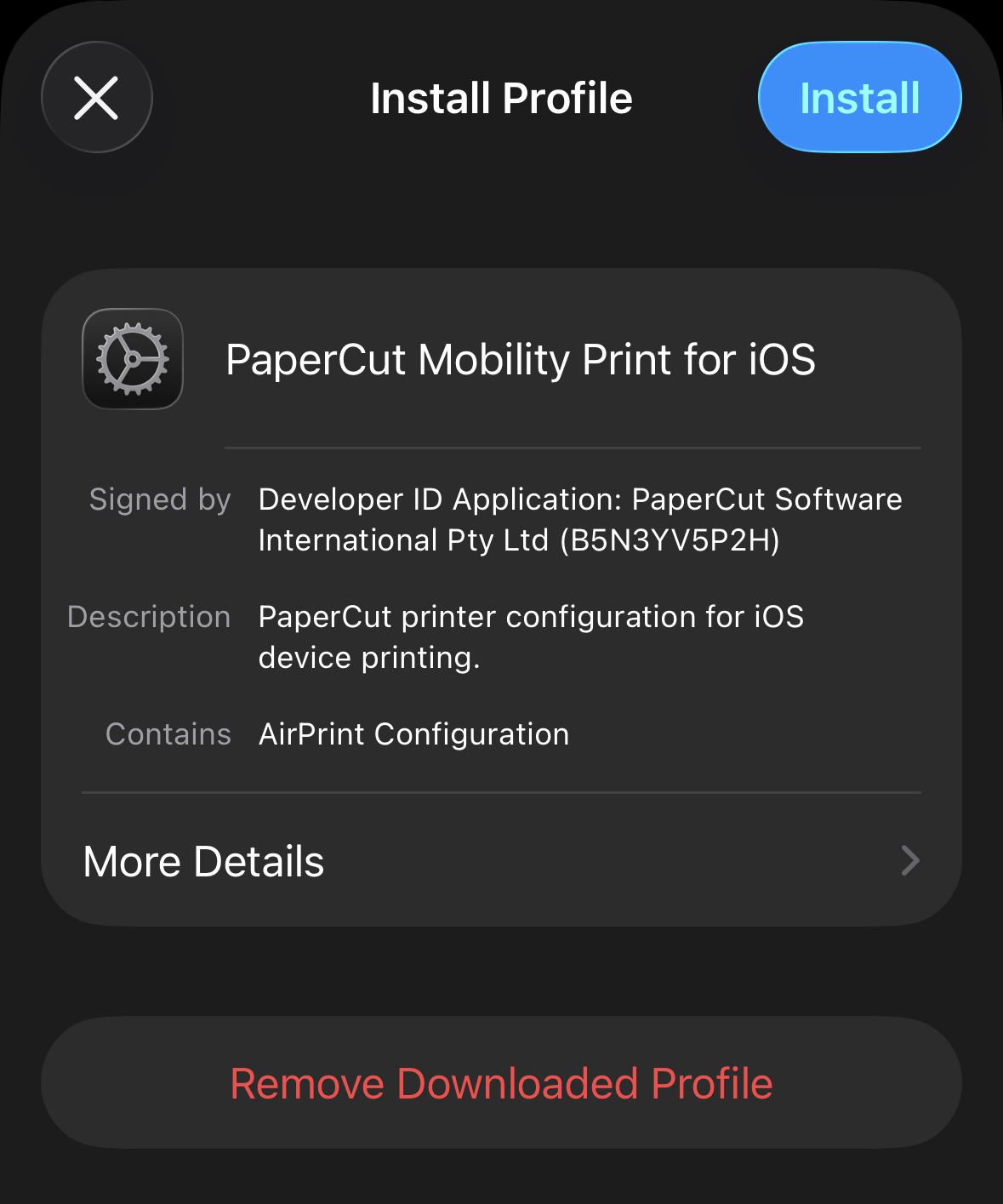 Step 4: Once downloaded, go to your Settings > General > VPN & Device Management > PaperCut Mobility Print for IOS.