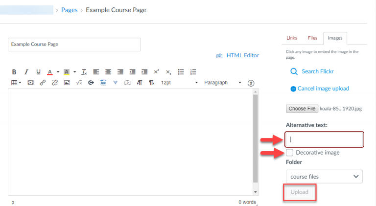 Images uploaded using the Rich Content Editor should have alternative text (alt text) describing their content for use by screen readers, unless they are specifically designated as decorative. The Accessibility Checker will flag pictures that lack alt text, but in fact Canvas’ image uploader is designed to prevent you from uploading pictures that lack alt text in the first place, even without the use of the Checker.