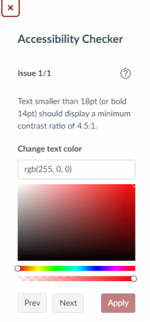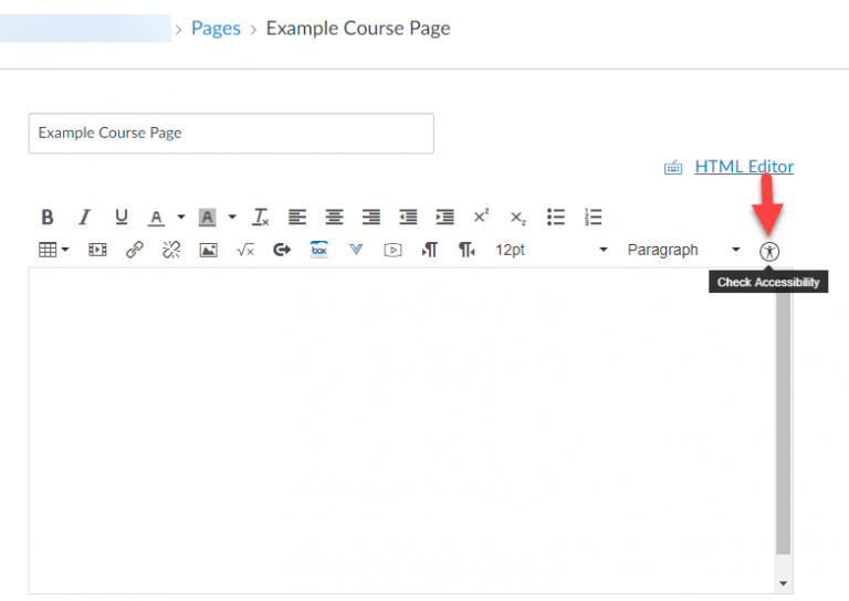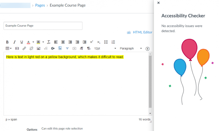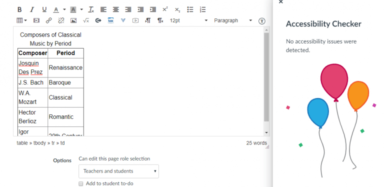 The Accessibility Checker is a powerful tool within Canvas’ Rich Content Editor that allows you to run a quick accessibility test on content you have created within the Editor, including text, images, and hyperlinks. Anywhere the Rich Content Editor is found — when you are creating a Canvas content page, an Assignment prompt, a Discussion prompt, or the like — the Accessibility Checker will appear in the toolbar, normally at the far right. With this tool, you can catch common errors that make Web content difficult to access for users with disabilities, and you can easily correct those errors as well before you save and publish your content. Once you have entered content into the Rich Content Editor, just click the Accessibility Checker icon to receive instant feedback.