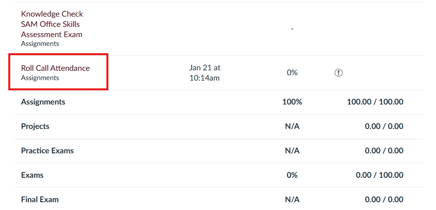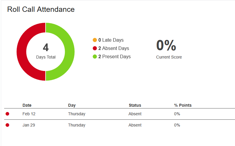 Click Roll Call Attendance and this will show you your attendance for the class.
