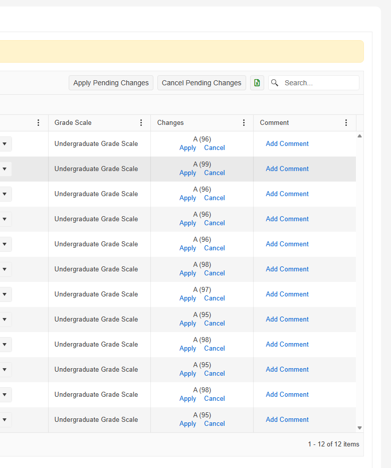To get to the following screen please ensure you are in the FINAL GRADES tab at the top. When grades are brought over automatically, it will look like the following, and display the students and their numeric and letter grades. Confirm these are the expected grades, or adjust grades as needed, then click the “apply” button for each student’s grade.