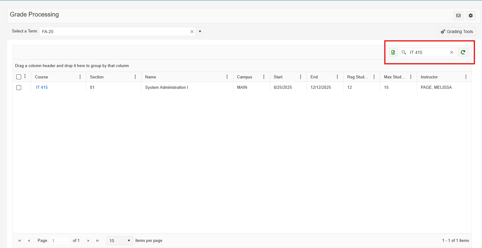 Search for the course you want to confirm the final grades for. In this example we are confirming the grades for the course IT 415.