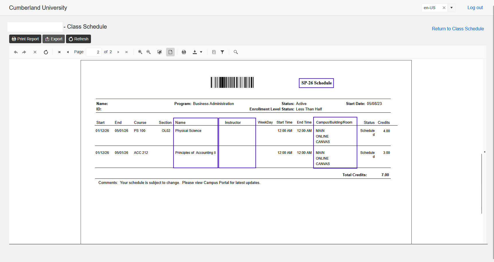 Here we will see an easier view to read of your class schedule, this view will also provide which building and classroom your class will be held in. (This example will show "Main Online Canvas" where the class will be held. If it is an In-Person class it will show for example "LH-210")
