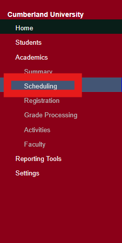 Navigate to Academics in the red column on the left side of the screen and then select Scheduling